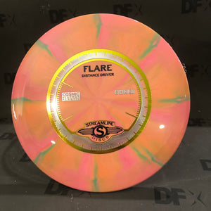 The Flare is an overstable distance driver from Streamline and is designed for flights with a minimal turn, ending with a powerfully overstable finish, and a reserved glide to prevent going long on the approach. The Flare is in the 19mm Driver class and is the first Streamline Speed 9 disc. A truly versatile disc whether fans are looking for something that can handle even the highest power throws, fighting the strongest winds, or for a wide range of utility shots, the Flare can handle them all. Burning brightly on the course, the Streamline Flare is coming to the rescue!